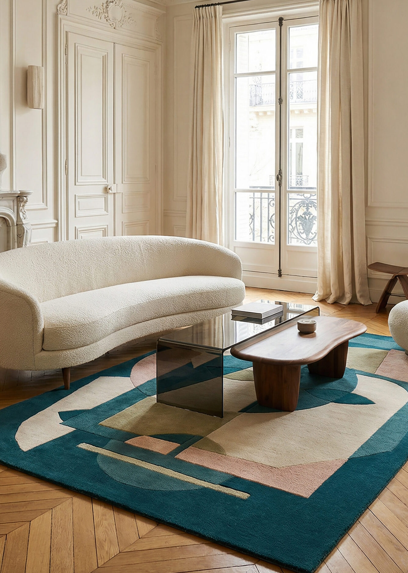 Technique and composition: The rug comes in 3 complementary colors. A terracotta carpet or a carpet in shades of blue, this true cubist painting is now available in a subtle palette of beiges and whites, while retaining its originality. Combining several qualities of wool in different thicknesses, it plays with relief effects and loop/cut textures and is similar to tapestry in the richness of its surface work.