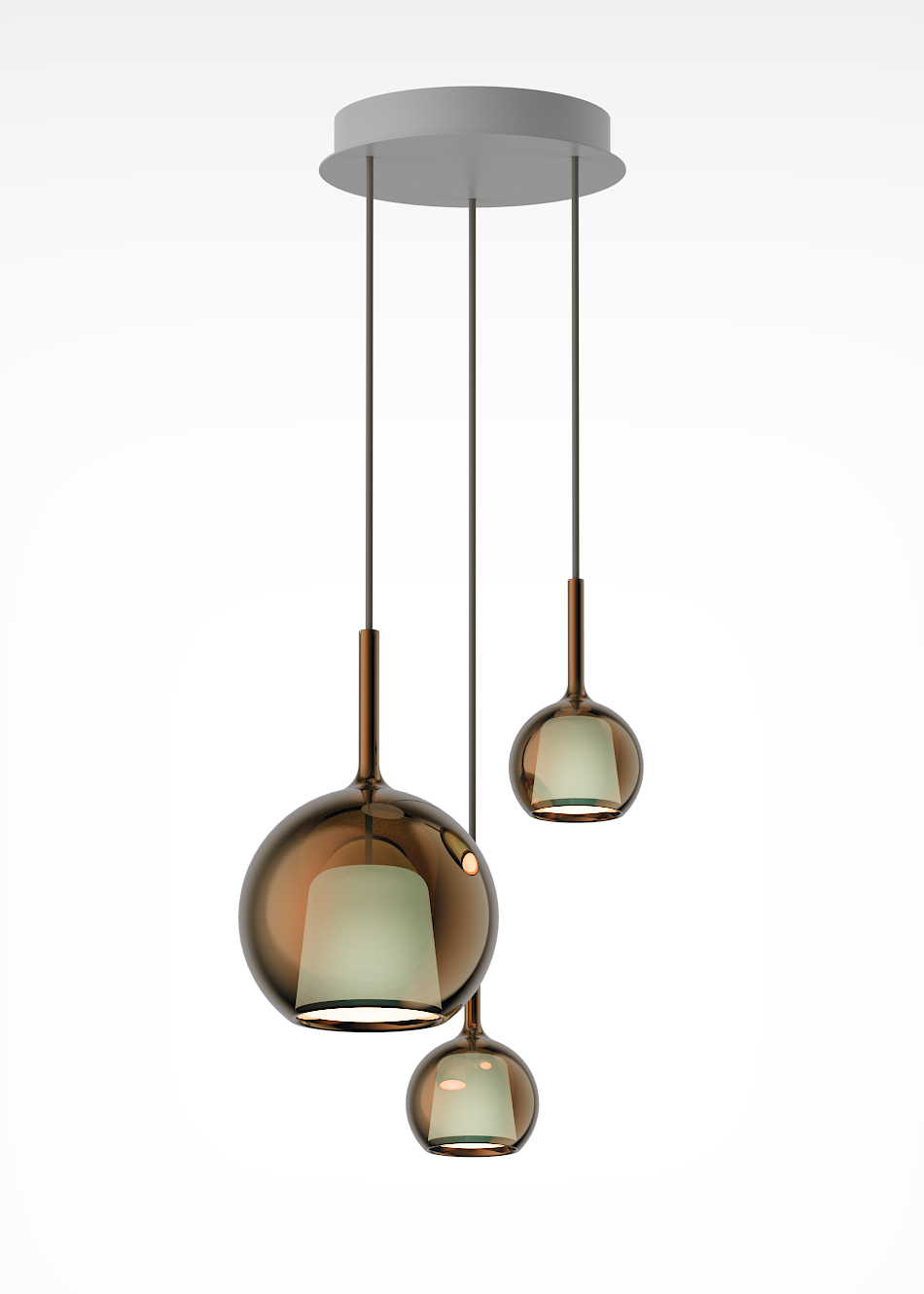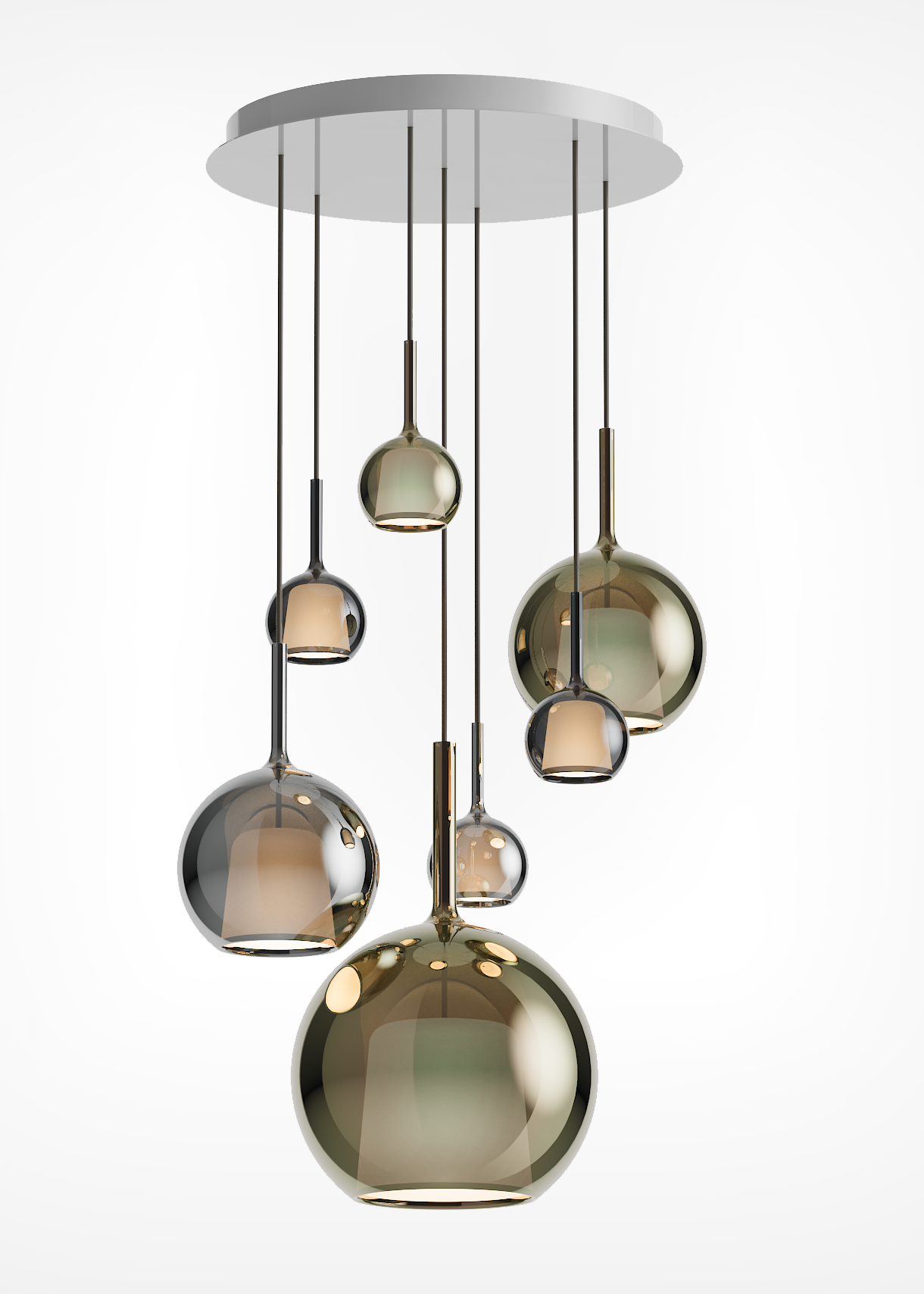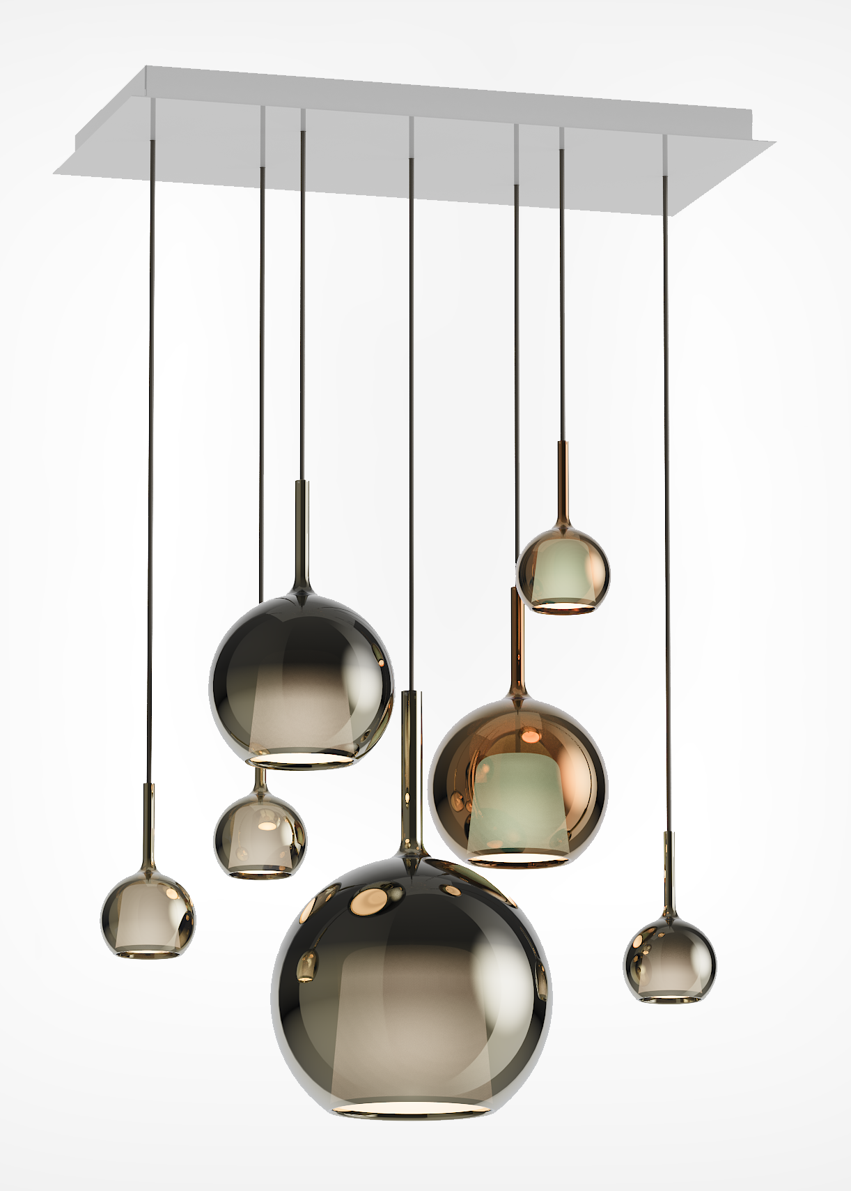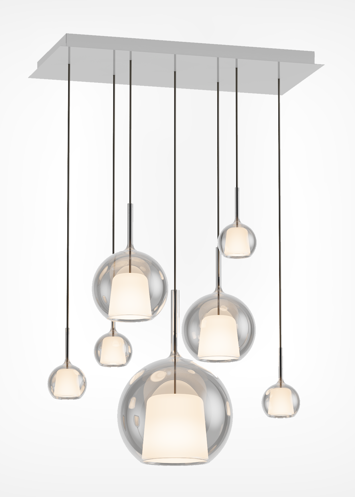 Each pendant is crafted from a luminous glass sphere that enhances the brilliance of light through mesmerizing reflections.