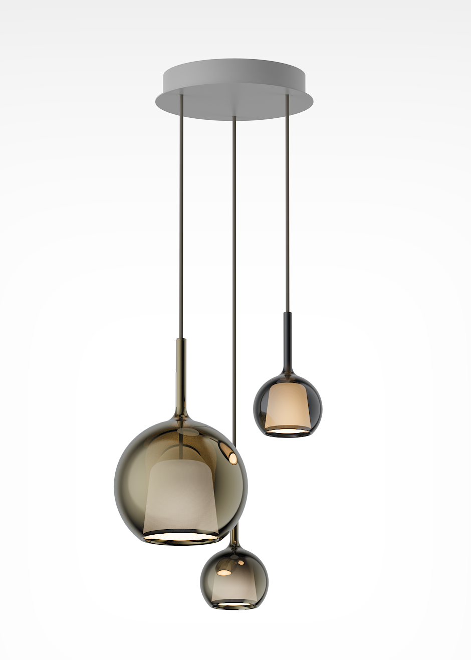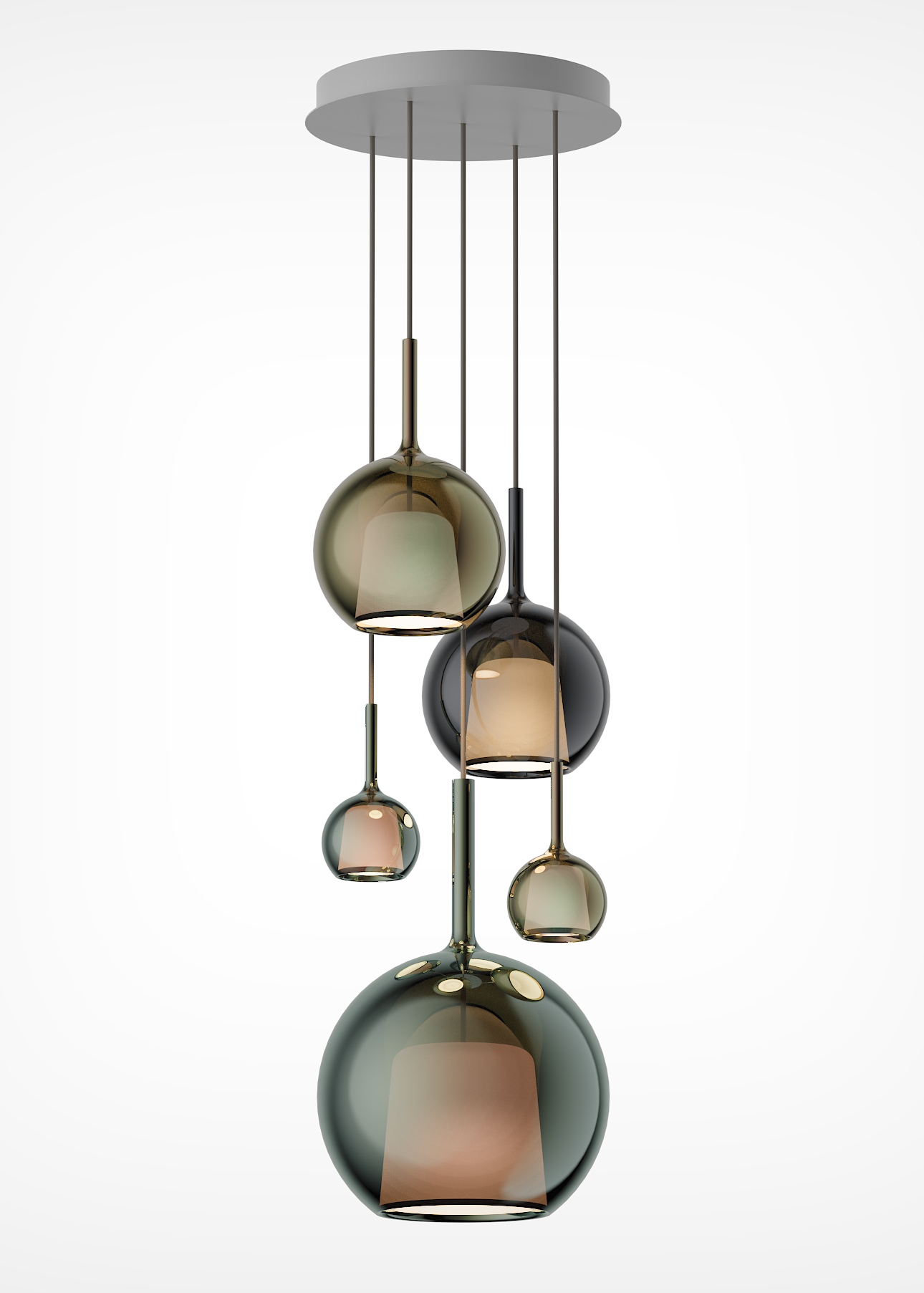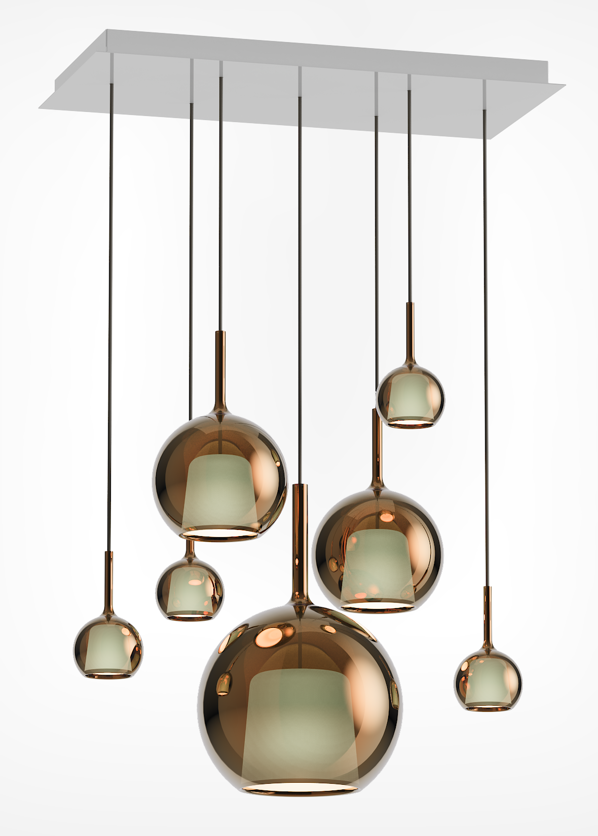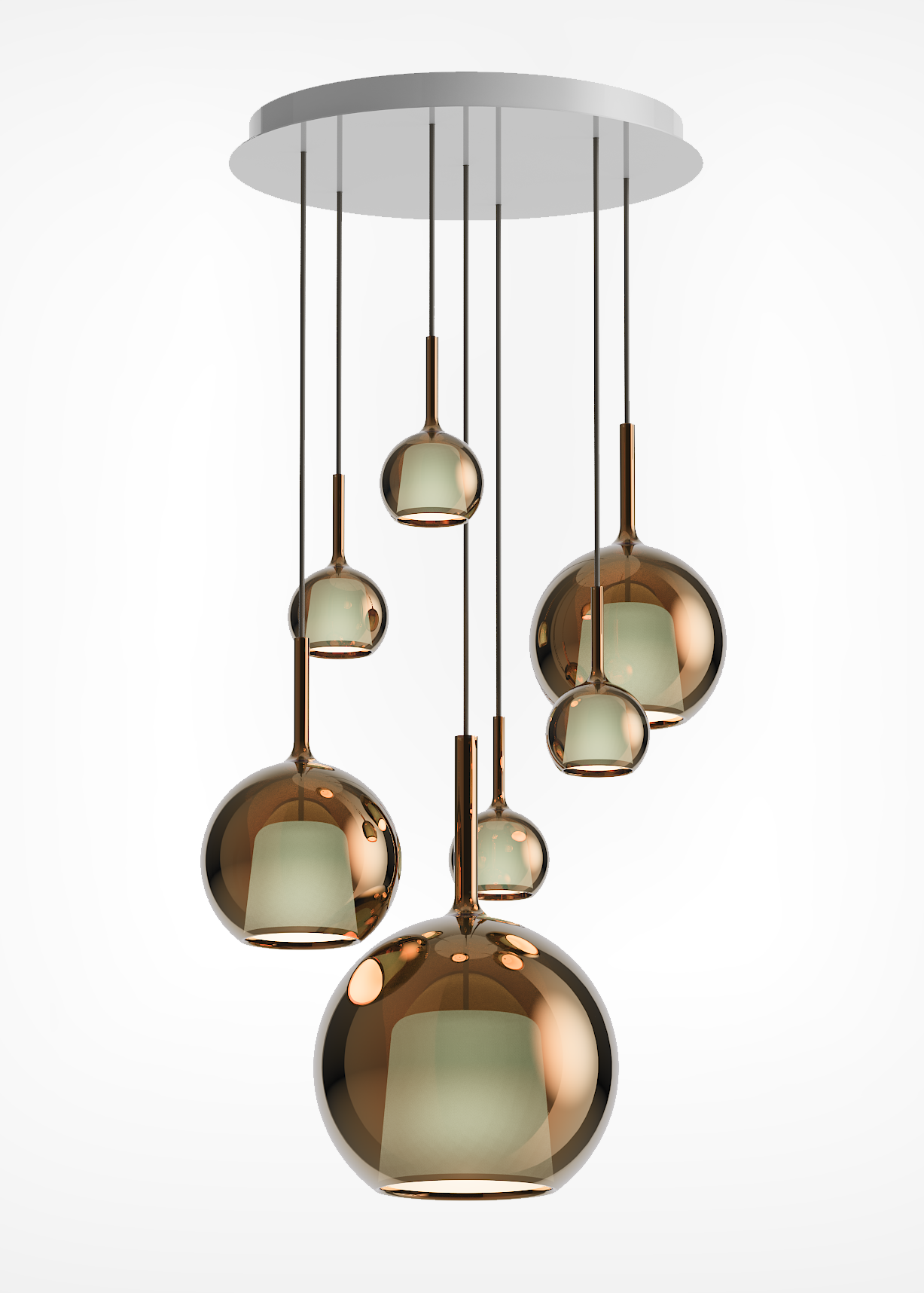 Each pendant is crafted from a luminous glass sphere that enhances the brilliance of light through mesmerizing reflections.