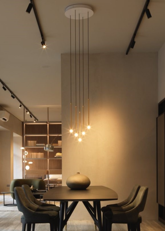 The Storm suspension features slender stems in refined metallic finishes, creating striking harmonies of light. Available in three sizes, this versatile pendant can stand alone as a statement piece or be grouped for dramatic compositions. Perfect for both residential interiors and large public spaces, Storm brings elegance and modern design to any setting.