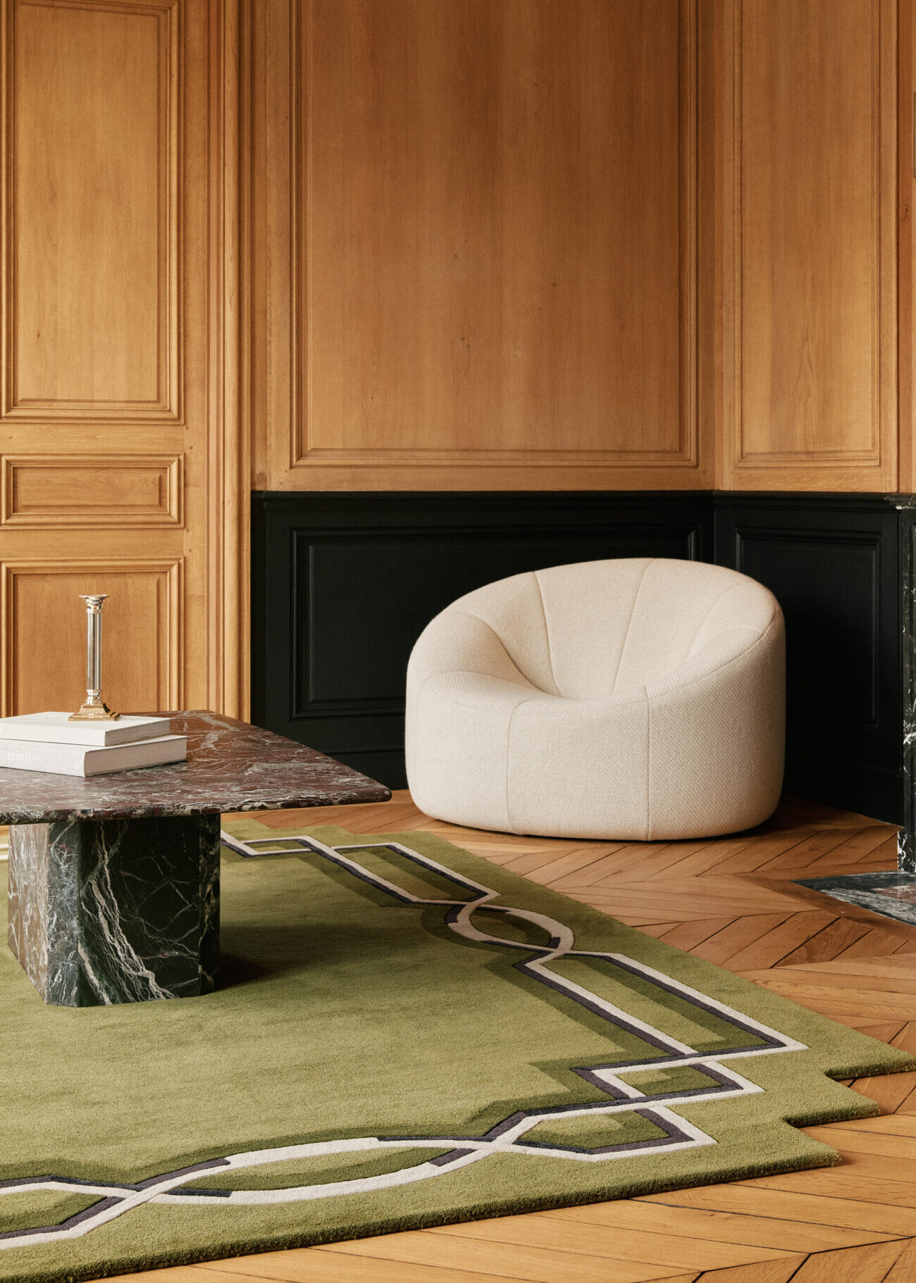 With its structured borders and interlaced lines, Style evokes opulent salons and sophisticated décors. Its hand-carved ornamentation, enhanced by pure wool in cut-pile tufting, reinterprets classicism with a modern sensibility. A deceptively demure rug, with a bold structure and refined, precious finishes.